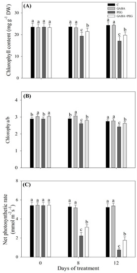 Effects of γ-aminobutyric acid (GABA) pretreatment on (A) total chlorophyll content, (B) chlorophyll a/b, and (C) net photosynthetic rate in leaves of creeping bentgrass under non-stress and water stress conditions. Vertical bars indicate ± SE of mean (n = 4). Different letters above columns indicate significant difference at a particular day based on the LSD (P ≤ 0.05). C, well-watered control; GABA, well-watered control pretreated with GABA; PEG, PEG-induced water stress; GABA + PEG, water-stressed plants pretreated with GABA.