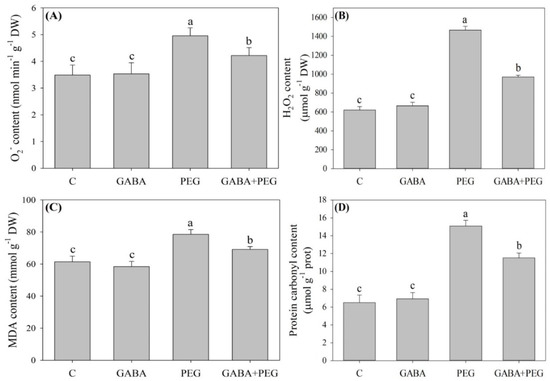 Effects of exogenous γ-aminobutyric acid (GABA) pretreatment on (A) superoxide anion (O2−) content, (B) hydrogen peroxide(H2O2) content, (C) malondialdehyde (MDA) content, and (D) protein carbonyl content in leaves of creeping bentgrass under non-stress and water stress conditions. Vertical bars indicate ± SE of mean (n = 4). Different letters above columns indicate significant difference based on the LSD (P ≤ 0.05). C, well-watered control; GABA, well-watered control pretreated with GABA; PEG, PEG-induced water stress; GABA + PEG, water-stressed plants pretreated with GABA.