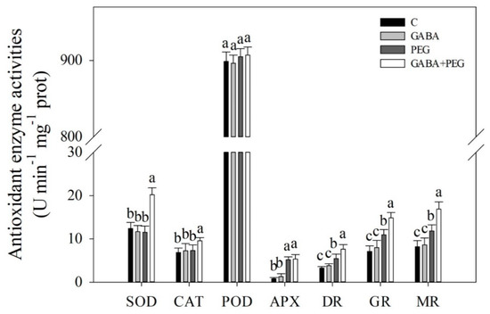 Effects of exogenous γ-aminobutyric acid (GABA) pretreatment on antioxidant enzyme activity in leaves of creeping bentgrass under non-stress and water stress conditions. SOD, superoxide dismutase activity; CAT, catalase activity; POD, guaiacol peroxidase activity; APX, ascorbate peroxidase activity; DR, dehydroascorbate reductase activity; GR, glutathione reductase activity; MR, monodehydroascorbate reductase activity. Vertical bars indicate ± SE of mean (n = 4). Different letters above columns indicate significant difference based on the LSD (P ≤ 0.05). C, well-watered control; GABA, well-watered control pretreated with GABA; PEG, PEG-induced water stress; GABA + PEG, water-stressed plants pretreated with GABA.