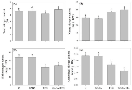 Effects of exogenous γ-aminobutyric acid (GABA) pretreatment on (A) total nitrogen content, (B) nitrate nitrogen content, (C) nitrite nitrogen content and (D) ammoniacal nitrogen content in leaves of creeping bentgrass under non-stress and water stress conditions. Vertical bars indicate ± SE of mean (n = 4). Different letters above columns indicate significant difference based on the LSD (P ≤ 0.05). C, well-watered control; GABA, well-watered control pretreated with GABA; PEG, PEG-induced water stress; GABA + PEG, water-stressed plants pretreated with GABA.