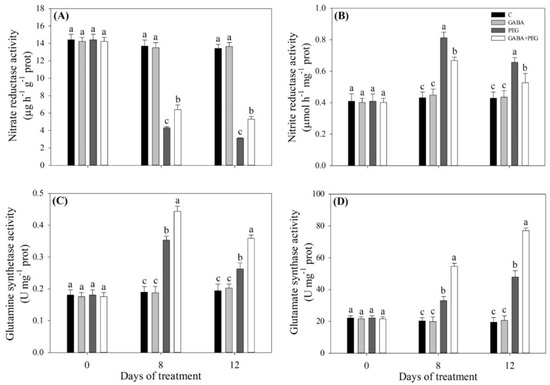 Effects of exogenous γ-aminobutyric acid (GABA) pretreatment on (A) nitrate reductase activity, (B) nitrite reductase activity, (C) glutamine synthetase activity, and (D) glutamate synthase activity in leaves of creeping bentgrass under non-stress and water stress conditions. Vertical bars indicate ± SE of mean (n = 4). Different letters above columns indicate significant difference at a particular day based on the LSD (P ≤ 0.05). C, well-watered control; GABA, well-watered control pretreated with GABA; PEG, PEG-induced water stress; GABA + PEG, water-stressed plants pretreated with GABA.