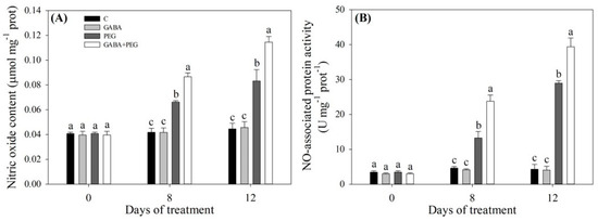 The N metabolism is one of the most basic physiological processes in plants due to the primary roles of N as a nutrient and in important components of many compounds, such as proteins, nucleic acids, enzymes, chlorophyll, vitamins, plant hormones and alkaloids [13]. The N metabolism affects plant growth and development, quality and yield of crops, and resistance to environmental stress [14]. Under drought stress, a higher N content could improve photosynthesis, antioxidant enzyme activities, and proline accumulation associated with better drought tolerance in rice [15]. N is also well known for its effects on reducing leaf senescence and enhancing heat tolerance under high temperature conditions [16,17]. Nitric oxide (NO) is an important product of N metabolism. As an important signaling molecule, NO plays a positive role in regulating various physiological processes in plants under normal and adverse conditions [18]. NO-associated protein (NOA) and nitrate reductase (NR) pathways dependent on N metabolism are the two main pathways of NO production in plants [19]. Under drought stress, NO promoted the wheat (Triticum aestivum) seed germination rate, embryo length, endopeptidase and amylase activities, and also increased antioxidant enzyme activities and proline content in wheat [20]. Under salt and heat stress, a low concentration of NO pretreatment could enhance photosystem II quantum production and antioxidant enzyme activities, thus improving the survival rate of rice seedlings [21]. NO treatment could alleviate the drought damage in wheat seedlings [22] and also effectively reduced the growth inhibition and lipid peroxidation in Elymus nutans under cold stress [23]. Until now, the role of GABA in regulating NO production, contributing to enhanced tolerance to water stress in plant species, has been unclear.