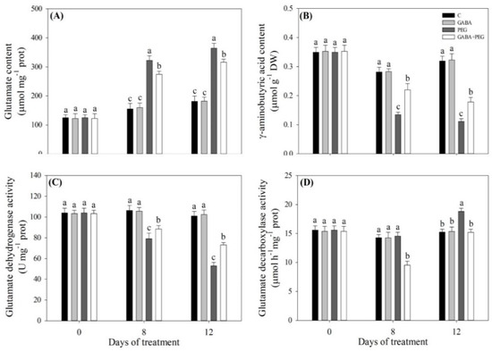 Effects of exogenous γ-aminobutyric acid (GABA) pretreatment on (A) glutamate content, (B) γ-aminobutyric acid content, (C) glutamate dehydrogenase activity, and (D) glutamate decarboxylase activity in the leaves of creeping bentgrass under non-stress and water stress conditions. Vertical bars indicate ± SE of mean (n = 4). Different letters above columns indicate significant difference at a particular day based on the LSD (P ≤ 0.05). C, well-watered control; GABA, well-watered control pretreated with GABA; PEG, PEG-induced water stress; GABA + PEG, water-stressed plants pretreated with GABA.