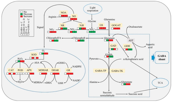 Integrative pathways induced by water stress and exogenous application of γ-aminobutyric acid (GABA) in leaves of creeping bentgrass under non-stress and water stress conditions. Red indicates a significant upregulation, green indicates a significant downregulation, and white indicates no significant change. C, well-watered control; GABA, well-watered control pretreated with GABA; PEG, PEG-induced water stress; GABA + PEG, water-stressed plants pretreated with GABA.