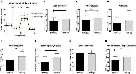 Seahorse extracellular flux analysis for mitochondrial metabolic parameters in TMRM-low and high cells. (A) Mitochondrial OCR curves; (B) basal respiration; (C) ATP production; (D) proton leak; (E) maximal respiration; (F) spare respiratory capacity; (G) coupling efficiency (%) and (H) non-mitochondrial oxygen consumption. OCR: oxygen consumption rates; Oligo: oligomycin; FCCP: carbonyl cyanide p-trifluoromethoxyphenylhydrazone; R: rotenone; A: antimycin A. Data are represented as mean ± SD. n = 5 per group. Statistical differences were calculated significant as * p < 0.05, ** p < 0.01, determined by Student’s t-test (B–G) and by Wilcoxon matched-pairs signed rank test (H).