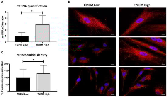 Mitochondrial analysis in TMRM-low and high cells. (A) mtDNA content was calculated using quantitative real-time PCR by measuring the ratio of mitochondrially encoded NADH: ubiquinone oxidoreductase core subunit 5 (ND5, mitochondrial encoded gene) to β2-microglobulin (B2M, nuclear encoded gene) DNA levels. Data are represented as mean ± SD. n = 5 per group. Statistical differences were calculated significant as * p < 0.05, determined by Student’s t-test. (B) Representative confocal pictures of MitoTracker Red CMXRos/DAPI to visualize the mitochondrial network. Magnification 63x. Calibration bar 10 µm. (C) Percent red fluorescence intensity of MitoTracker staining was calculated using ImageJ software. Data are represented as mean ± SD. Statistical differences were calculated significant as * p < 0.05, determined by Student’s t-test.