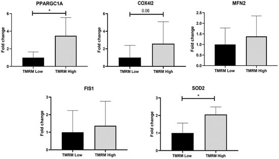 Mitochondrial gene expression in TMRM-low and high cells. mRNA levels were determined by qRT-PCR. PPARGC1A: Peroxisome proliferator-activated receptor gamma coactivator 1-alpha; COX4I2: cytochrome c oxidase subunit 4I2; MFN2: mitofusin 2; FIS1: Fission, mitochondrial 1; SOD2: superoxide dismutase 2. Data are represented as mean ± SD of the fold change. n = 5 per group. Statistical differences were calculated significant as * p < 0.05, determined by Student’s t-test.