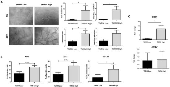 In vitro endothelial differentiation in TMRM-low and high cells. (A) Cultrex assay: representative images of tubular-like structures formation in TMRM-low and TMRM-high cells on Cultrex membrane. The left panels show the quantification of tubular-like structures per microscopic field at 4 h and 20 h. The right panels show the number of branching points between tubular-like structures at 4 h and 20 h. In these conditions (n = 6); (B) FACS analysis: bar graphs show the expression of VEGFR-2/KDR, CD31, and vascular endothelial (VE)-cadherin/CD144 in TMRM-low and TMRM-high cells after culture into endothelial growing medium-2 (EGM-2) for 1 week. In these conditions (n = 3); (C) gene expression: bar graphs show the expression of VEGFR-2/KDR and NOS3 in TMRM-low, and TMRM-high cells after culture in EGM-2 for 1 week. Data are represented as mean ± SD of the fold change. Statistical differences were calculated significant as * p < 0.05, determined by Student’s t-test.
