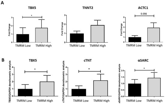 To analyze the predisposition of TMRM-low and high to differentiate toward a cardiomyogenic phenotype, we cultured the two populations in cardiac differentiation medium for 7 days and we evaluated the expression of early and late cardiomyogenic markers. We found a general trend of higher expression of T-box transcription factor 5 (TBX5), cardiac troponin T (cTNT) (TNNT2), and α-Sarcomeric Actin (ACTC1), both at genes (Figure 7A) and protein (Figure 7B) levels, in the high population. Particularly, the gene expression of the early cardiomyogenic marker TBX5 resulted significantly upregulated in TMRM-high cells after 7 days of culture (n = 5; TBX5/B2M fold change 1.00 ± 0.77 TMRM-low vs. 1.76 ± 0.99 TMRM-high; p = 0.04). Only a trend of increase expression was reported for the late cardiomyogenic genes TNNT2 and ACTC1 at this time-point. In the same culture conditions, the expression of the proteins TBX5, cTNT, and alpha sarcomeric actin (α-SARC) resulted significantly higher in the TMRM-high populations, if compared to the TMRM-low counterpart (n = 4; TBX5/GAPDH densitometric analysis 1.00 ± 0.60 TMRM-low vs. 2.01 ± 0.85 TMRM-high; p = 0.04; cTNT/GAPDH densitometric analysis 1.00 ± 0.43 TMRM-low vs. 2.18 ± 0.86 TMRM-high; p = 0.05; α-SARC/GAPDH densitometric analysis 1.00 ± 0.32 TMRM-low vs. 1.44 ± 0.41 TMRM-high; p = 0.02).