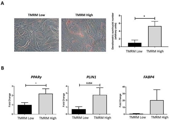 In vitro adipogenic differentiation of TMRM-low and high cells. (A) The culture in pro-adipogenic conditions for 1 week favored morphological differentiation in particular of TMRM-high cells, as evidenced by accumulation of lipid droplets in the cytoplasm, stained by Oil-Red-O (left panels). The bar graph shows the relative quantification (right panel). (B) Expression of the pro-adipogenic genes PPARγ: peroxisome proliferator-activated receptor gamma, PLIN1: perilipin 1, and FABP4: fatty acid-binding protein 4. Data are represented as mean ± SD of the fold change. n = 4 per group. Statistical differences were calculated significant as * p < 0.05, determined by Student’s t-test.