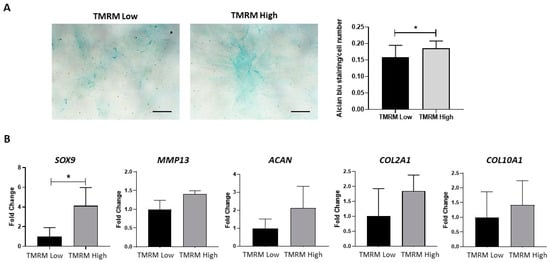 In vitro chondrogenic differentiation of TMRM-low and high cells. (A) The culture in pro-chondrogenic conditions for 2 weeks favored increased in sGAG synthesis, as evidenced by Alcian blue staining (left panel). Bar graph shows the relative quantification (right panel). (B) Expression of early and late genes involved in chondrogenesis SOX9: SRY-box transcription factor 9, MMP13: matrix metallopeptidase 13, ACAN: aggrecan, COL2A1: collagen type II alpha 1 chain and COL10A1: collagen type X alpha 1 chain. n = 3 per group. Data are represented as mean ± SD of the fold change. n = 3 per group. Statistical differences were calculated significant as * p < 0.05, determined by Student’s t-test.