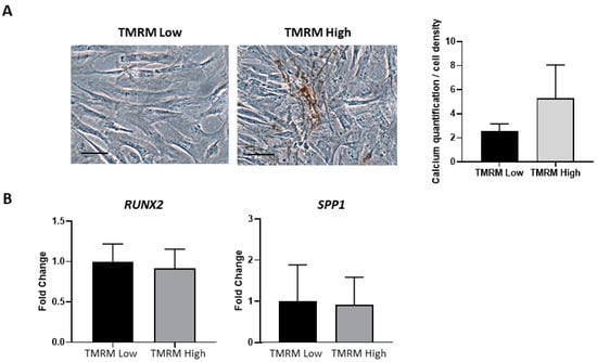 In vitro osteogenic differentiation of TMRM-low and high cells. (A) The culture in pro-osteogenic conditions for 1 week enhance the expression of calcium salts, although not significantly (left panel). The bar graph shows the relative quantification (right panel). (B) Expression of genes involved in osteogenesis RUNX2: runt-related transcription factor 2, SPP1: secreted phosphoprotein 1. Data are represented as mean ± SD of the fold change. n = 3 per group. Statistical differences were determined by Student’s t-test.