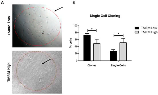 Single cell cloning of TMRM-low and high cells. Representative light microscopy images of TMRM-low and high cells after 1 week of single cells cloning assay (left panel). Bar graph identify the numbers of clones and single cells present after 1 week of culture for both the considered populations. Data are represented as mean ± SD. n = 3 per group. Statistical differences were calculated significant as * p < 0.05, determined by Student’s t-test.
