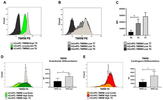 TMRM transition in culture and during differentiation. (A) Fluorescence levels of TMRM in the hCmPC population: before sorting (green histogram) and after selection to separate the population with the highest levels of TMRM (high, light grey histogram) from the population expressing the lowest levels of TMRM (low, black histogram). (B) Histogram plot of the transition level of TMRM expression in TMRM-low population in a time course experiment from T0 to T7 and its relative quantification (C). (D,E) Histogram plot and quantification of TMRM expression levels shown as MFI in TMRM-low and high population after endothelial (D) and cardiomyogenic (E) differentiation. Data are represented as mean ± SD. n = 3 per group. Statistical differences were calculated significant as * p < 0.05, determined by Student’s t-test.