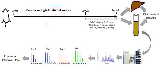 The present study used a combination of biological and analytical methods to detail the early metabolic perturbations, including those involved in lipid and glucose homeostasis, in an HFD-induced obesity model. Additionally, we analyzed the plasma HDL proteome dynamics to gain unique insights into concurrent changes in HDL proteome composition using a heavy water-based (2H2O, a non-radioactive isotope) metabolic labeling approach [21]. This method is based on the rationale that a loading dose of 2H2O rapidly labels amino acids prior to their incorporation into newly made proteins. The rate of labeled amino acids incorporation into the specific protein depends on the rate of synthesis of the protein. Tryptic peptides are analyzed by high-resolution mass spectrometry and protein turnover rates are assessed based on 2H enrichment of peptides (Figure 1) [22]. We have previously applied this method to a mouse model of NAFLD and demonstrated that HFD results in an increased degradation of plasma and hepatic mitochondrial proteins [23,24,25].
