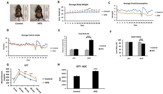 The HFD consumption for four weeks led to an obesogenic effect with mice showing a generally increased adiposity and increased body weight (Figure 2A,B). While the HFD group showed lower average daily food consumption (in grams) (Figure 2C), the two groups were evenly matched in respect to kilocalories consumed each day (Figure 2D). A body composition analysis revealed a significant increase in total body fat in the HFD group (fat content (%), 5.95 ± 0.27 vs. 16.22 ± 0.32, control vs. HFD, respectively) (Figure 2E). A statistically significant decrease in lean mass (%) was observed in the HFD group (76.73 ± 1.58) over the control group (87.76 ± 0.65) (Figure 2F). The HFD mice showed basal fasting hyperglycemia (Figure 2G) and impaired glucose tolerance assessed in the third week of the feeding protocol. The increased area under the curve in the glucose tolerance test is suggestive of insulin resistance in the HFD mice (Figure 2H). This is consistent with previous studies demonstrating insulin resistance based on glucose tolerance tests and hyperinsulinemia even as early as three days after an HFD feeding regimen [16]. The hyperglycemia observed in these mice (211.7 ± 13.5 mg/dL) was in the prediabetes range [26].