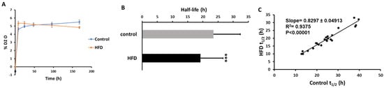 Our labeling protocol resulted in ~5% body water enrichment in mice (Figure 3A). A total of 96 and 89 proteins were identified in ApoB-depleted plasma in all animals from the control and HFD groups, respectively. Overall, 78 of these proteins were present in both groups. Due to the stringent criteria listed above, the kinetics of only 35 proteins could be accurately quantified in all animals from both groups. Each of these proteins has previously been characterized in HDL particles [34]. The proteome dynamics study revealed that the HFD resulted in increased turnover rates (i.e., a reduced half-life) of two-thirds (67%) of all analyzed proteins (Table 2). The average half-life of HDL-associated proteins was significantly reduced in HDL isolated from HFD-fed mice (23.52 ± 8.8 h in control vs. 19.23 ± 7.39 h in HFD, p < 0.05) (Figure 3B). This effect of HFD on plasma HDL protein kinetics was also shown in a scatter plot of the half-life of proteins in the HFD group relative to the control group (Figure 3C). In addition to a significant correlation of half-lives of proteins in control and HFD groups (r2 = 0.938, p < 0.0001), the slope of the regression curve (0.83) indicates that the mean half-life of proteins was reduced by ~17% due to four weeks of HFD consumption in mice.