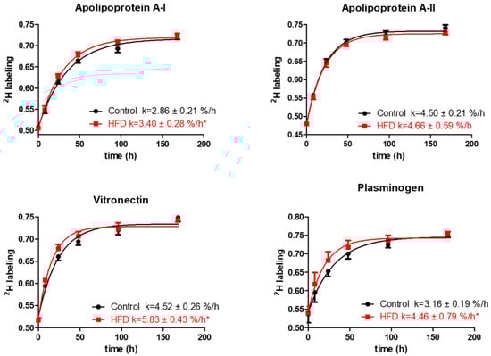 Typical kinetics curves of HDL proteins. The time course of 2H-labeling of apolipoprotein A-I, apolipoprotein A-II, vitronectin, and plasminogen peptides is shown for mice fed either the control diet or the HFD groups. The fractional catabolic rate is denoted by the rate constant k. Statistical significance, * indicates p < 0.05 compared to control.