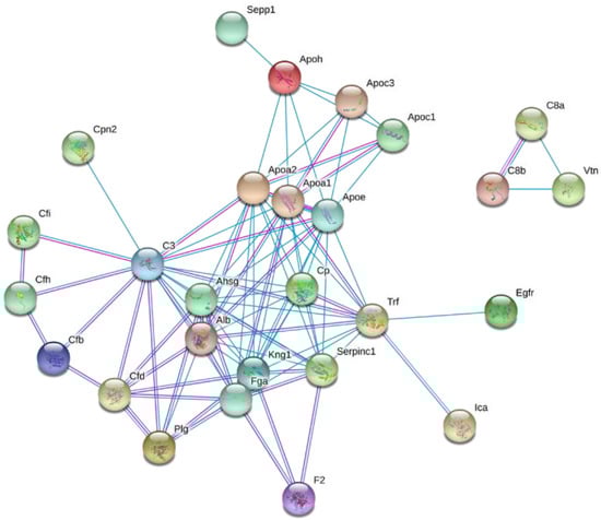 To explore the biological significance of the altered plasma HDL proteome dynamics in the context of diet-induced obesity, the changes in protein turnover were further analyzed using STRING [41]. The functional grouping revealed that the majority of the proteins with increased turnover are associated with pathways involved in the innate immunity and inflammation, protein degradation, acute-phase response, and lipid and vitamin transport (all p < 0.05) (Figure 5). Consistent with these results, STRING-based pathway analysis suggested HFD-induced activation of the alternative complement pathway (Supplementary Figure S2). Recently, we demonstrated a similar stimulation of the alternative complement pathway in LDLR-/- mice fed a Western-type diet for 12 weeks [42]. The pathway analysis also demonstrated that the HFD significantly increased the flux of proteins involved in the stress response suggesting that the short-term HFD results in a hepatic acute-phase response leading to a pro-inflammatory remodeling of the HDL proteome.