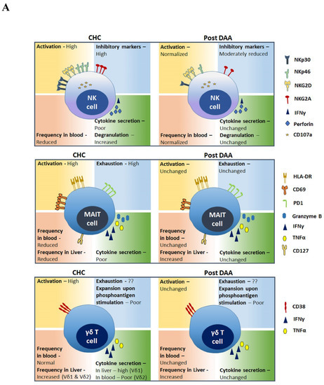 Visual summary of perturbations in frequency, phenotypes, and function of innate (A) and adaptive (B) lymphocytes in chronic hepatitis C virus (HCV) (CHC) patients and restoration associated with direct acting antiviral (DAA)-mediated viral clearance.