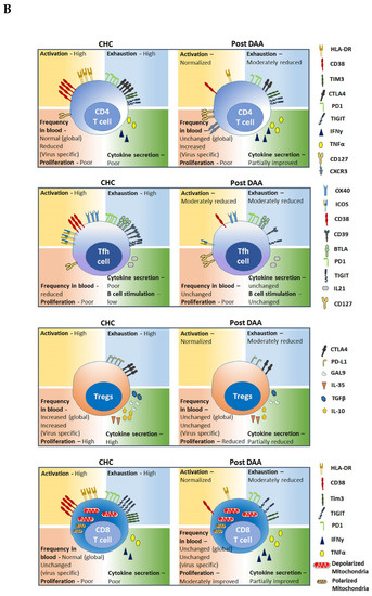 The human immune system efficiently controls most of the viral infections through strong sterilizing immunity mediated by various innate (non-specific; e.g., NK cells, gamma-delta T cells, MAIT cells) and adaptive (virus-specific; e.g., CD4+ Th1, Tfh, Th17 cells, CD8+ cytotoxic T cells, B cells) immune cell types. However, certain viruses including HCV can evade the immune system and develop chronic infection in some individuals. For development of chronicity, two fundamental events need to occur; first, the virus must evade the host sterilizing immunity and second, the host immune system must adjust to the continuous presence of viral antigen-driven inflammatory responses in order to limit viral replication to an acceptable level without permanent damage to infected tissues [159]. This adaptation comes in the form of transcriptional, metabolic, and epigenetic changes in immune cells. Whether these changes are permanent or reversible once the antigen is removed is a significant question in immunology, which can now be addressed in CHC patients that are cured with highly effective DAA treatments.