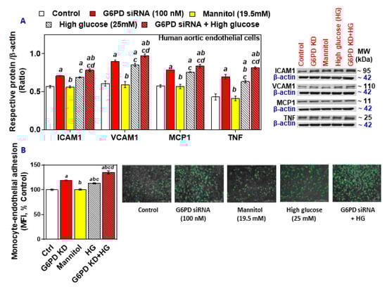 Protein levels of ICAM-1, VCAM-1, MCP-1, and TNF were upregulated in the G6PD-deficient HAEC, as well as in the HG group, and the effect was much higher in the G6PD-deficient group exposed to high glucose (Figure 2A). Monocyte-endothelial cell adhesion was also increased in the G6PD-deficient cells and the HG-treated cells (Figure 2B). Thus, the G6PD deficiency, along with hyperglycemia, may favor endothelial dysfunction by increasing levels of inflammatory cytokines, upregulating cell adhesion molecules, and facilitating the adhesion of monocytes.