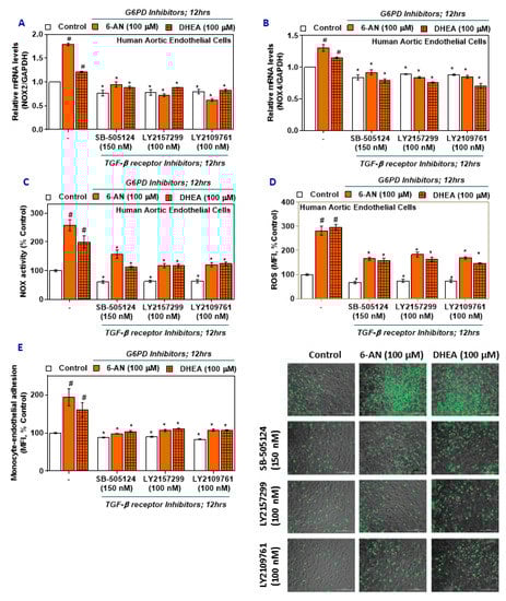 Supplementary materials can be found at https://www.mdpi.com/1422-0067/21/20/7474/s1. Supplementary Table S1. List of FAM-labeled TaqMan®® primer/probe sets used for quantitative RT-PCR analysis. Supplementary Table S2. List of antibodies and dilutions used for Western blot analysis. Figure S1. (A–I) The effect of metabolic insults created by treatment with high glucose (HG; 25 mM) or palmitate (200 µM) on G6PD, TGF-β1, TGF-β1 receptors, and NADPH oxidases (NOX) in human aortic endothelial cells (HAEC) and monocyte-endothelial cell adhesion. Figure S2. (A–H) The effect of L-cysteine ethyl ester (LC ee) on TGF-β/NOX in H2O2-treated HAEC and monocyte-endothelial cell adhesion.