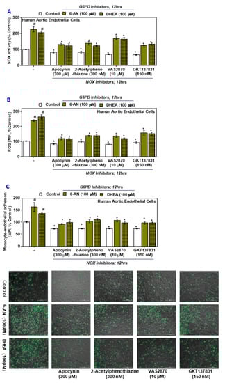 Cells treated with either a G6PD inhibitor (6-AN or DHEA) followed by with treatment with NADPH oxidase inhibitors (apocynin, 2-acetylphenothiaznine, VAS2870, and GKT137831) showed significant upregulation of NOX activity, ROS in HAEC, and monocytic adhesion with the endothelium compared with the results observed in the groups treated with G6PD inhibitors alone (Figure 4A–C). However, while still being significantly higher (Figure 4A–C) compared to control HAEC and G6PD inhibitor treated control groups, the relative magnitude decreased following treatment with the NOX inhibitors. Inhibiting the NOX components, the primary source of superoxide, decreases oxidative stress and reduces monocytic adhesion with the HAEC.