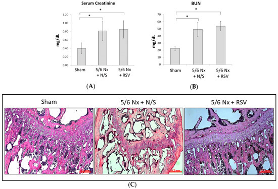 To evaluate the injured renal effects of mice undergoing 5/6 nephrectomy (Nx) surgery, the serum levels of creatinine and blood urea nitrogen (BUN) were measured 4 weeks after surgery. The levels of serum creatinine in the 5/6 Nx with RSV treatment group (0.82 ± 0.23 mg/dL, n = 6) and normal saline (N/S) treatment group (0.85 ± 0.21 mg/dL, n = 6) significantly increased compared to the sham group (0.40 ± 0.13 mg/dL, n = 6; p < 0.05, respectively), as did the levels of BUN (49.32 ± 9.94 mg/dL or 53.78 ± 6.78 mg/dL vs. 22.63 ± 3.08 mg/dL; p < 0.05, respectively) (Figure 1A,B). This result shows that the 5/6 Nx procedure successfully induced impaired renal function in mice.