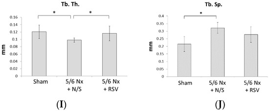 The radiation (micro-CT) images demonstrated that the 5/6 Nx + N/S group had the thinnest epiphyseal plate and the highest cancellous bone mass porosity (Figure 1F). However, mice with 5/6 Nx + RSV had a healthier epiphyseal plate and cancellous bone mass compared to mice with 5/6 Nx +N/S, which further supports the role of RSV in improving bone quality. The bone volume over total volume (BV/TV), trabecular number (Tb. N.), and trabecular thickness (Tb.Th.) of 5/6 Nx + N/S were decreased compared to the sham group (Figure 1G–I). By contrast, trabecular separation (Tb.Sp.) was significantly increased compared to the sham group (Figure 1J). However, RSV treatment for 4 weeks ameliorated the effects on Tb. N. and Tb.Th. in mice undergoing 5/6 Nx surgery (Figure 1H,I).