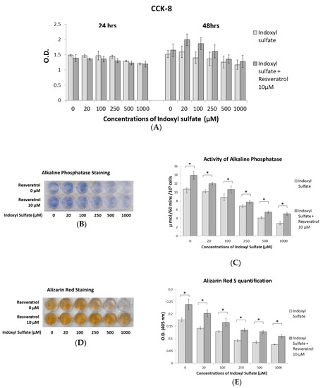 Effects of RSV on indoxyl sulfate (IS)-induced impaired osteoblast development. Primary osteoblast cells were cultured in an osteogenesis medium with IS at 0, 20, 100, 250, 500, and 1000 μM with or without 10 μM RSV. (A) A Cell Counting Kit-8 (CCK-8) assay was used to determine osteoblast cell viability. Cell viability is not significantly affected by different concentrations of IS or RSV at 24 and 48 h. (B) Primary osteoblast cells were cultured for 14 days, and alkaline phosphatase staining exhibited a dose-dependent decrease in response to increasing IS concentrations. The RSV treatment group increased the overall activity of alkaline phosphatase, as indicated by staining. (C) The alkaline phosphatase activity assay demonstrates that culturing the primary osteoblast cell culture for 14 days with RSV can significantly enhance alkaline phosphatase activity. (D) Primary osteoblast cells were cultured for 21 days; the level of Alizarin Red staining shows a dose-dependent decrease in response to increasing IS concentrations. The RSV-treated group improved the staining of Alizarin Red. (E) Alizarin Red staining quantification demonstrates that RSV treatment can significantly increase staining. Data are represented as the mean ± SEM (n = 6). * Indicates differences that were considered significant between the indicated groups (p < 0.05).