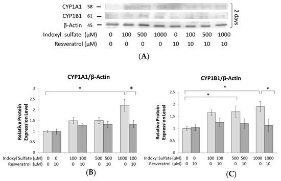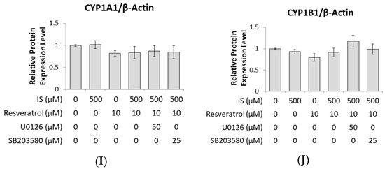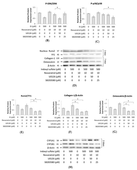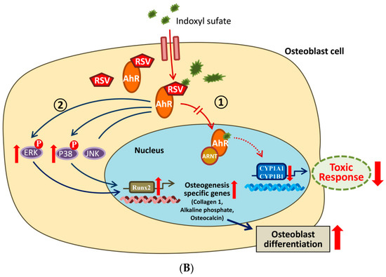 Some evidence from previous reports has shown that RSV efficiently limits the induction of CYP1A1 via the AhR ligand [55]. In our data, we obtained a similar result, showing that RSV treatment can block the elevation of CYP1A1 and CYP1B1 in protein and mRNA levels induced by IS (Figure 3A–D). Dai et al. suggested that RSV (10−8~10−5 M) enhances the proliferation of human stem cells and the differentiation of osteoblastic cells in a time- and dose-dependent manner through ERK1/2 activation, which increases alkaline phosphatase activity and calcium deposition in human BMSC cultures [14]. In our study, we also found that the suppression of osteoblast development markers by IS could be restored by RSV (Figure 3G).