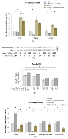 Several researchers have discussed the key roles of AhR in bone development [23,44]. For example, TCDD activates AhR signaling and inhibits osteoblast differentiation from bone marrow-derived stem cells (BMSCs) [45], promotes deterioration of the bone remodeling process, and weakens bone strength [46]. In an in vivo study, mice treated with RSV presented an improvement with increased bone mineral density and bone mass [47]. In our study, we obtained similar results showing that AhR is influenced by IS and RSV. We demonstrated that 500 μM IS can enhance the expression of AHR mRNA, which could be attenuated by 10 μM RSV (Figure 3D). In addition, osteoblast development markers exhibited an opposite outcome when affected by IS and RSV (Figure 3G).