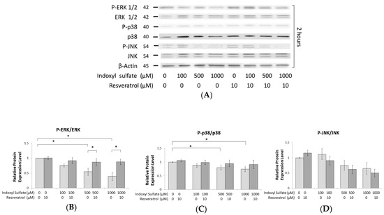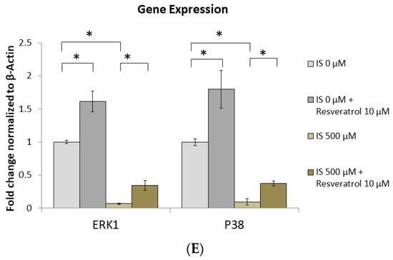 IS inhibits the phosphorylation of ERK and p38 MAPK. MC3T3 E1 cells were cultured in an osteogenesis medium with IS at 0, 100, 500, and 1000 μM with or without RSV for 2 h. (A–D) In whole cells, the phosphorylation of ERK1/2 and p38 decreased in a dose-dependent manner with the concentration of IS. At 500 and 1000 μM IS, ERK1/2 and p38 MAPK phosphorylation was significantly suppressed in comparison to the control group. RSV significantly alleviated ERK1/2 phosphorylation at 500 and 1000 μM IS. (E) At 500 μM IS, the expression of ERK1 and p38 genes was significantly reduced compared to their levels in the control group. When RSV is also added, the expression of ERK1 and p38 genes is significantly increased in response to IS treatment at 0 and 500 μM. Data are represented as the mean ± SEM (n = 3). * Indicates differences that were considered significant between the indicated groups (p < 0.05).