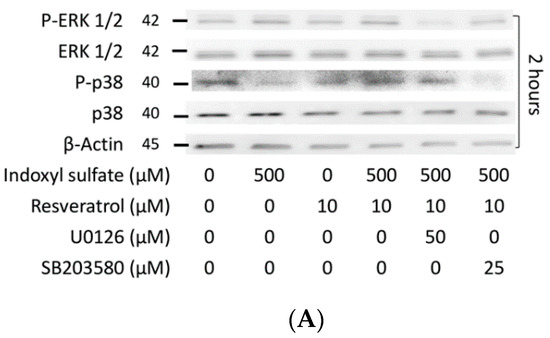 Several studies have detected cross-talk between AhR and multiple transduction signaling, particularly the MAPK pathway [50]. TCDD and benzo[a]pyrene are conventional AhR agonists, which can also initiate the MAPK pathway [51]. Dou et al. reported that indole-3 acetic acid (IAA), another indolic uremic toxin, initiates the phosphorylation of ERK and p38 MAPK to increase the expression of tissue factor (TF) in human endothelial cells. Later, the authors demonstrated that IAA binds with AhR to induce the cytoplasmic p38 MAPK signaling pathway [52], which resulted in TF upregulation by IAA [53]. Furthermore, the authors demonstrated that p38 MAPK is downstream of AhR and also argued that this non-genomic AhR pathway is not related to ERK signaling [53]. In another study, Yu et al. demonstrated that TCDD activated AhR, which inhibited osteoblast proliferation and differentiation due to the Ahr-dependent activation of the ERK MAPK signaling pathway [54]. However, we found that the phosphorylation of ERK and p38 MAPK is then suppressed by IS, which disagrees with the above results acquired with IAA and TCDD. Moreover, RSV was able to alleviate the suppression of the phosphorylation of ERK and p38 MAPK under IS exposure in our study.