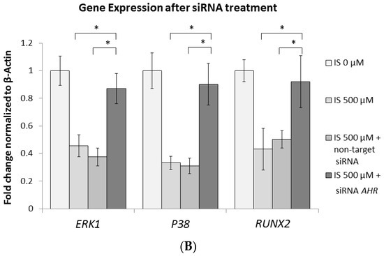 AHR Knockdown results in suppressed CYP1A1 and CYP1B1 gene expression and elevated ERK1, P38, and RUNX2 gene expression. After 1 day of pretreatment with small interfering RNA (siRNA) AHR, or non-target siRNA, MC3T3-E1 cells were cultured in an osteogenesis medium with IS at 0 or 500 μM for 2 days. (A) At 500 μM IS, the expression of AHR, CYP1A1, and CYP1B1 genes was significantly suppressed in the siRNA AHR group compared with the 500 μM IS alone and non-target groups. (B) At 500 μM IS, the gene expression of ERK1, P38, and RUNX2 was significantly enhanced in the siRNA AHR group when compared to the 500 μM IS alone and non-target groups. Data are represented as the mean ± SEM (n = 3). * Indicates differences that were considered significant between the indicated groups (p < 0.05).