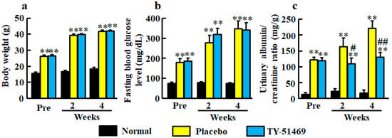 Body weight (a), fasting blood glucose level (b), and urinary albumin/creatinine ratio (c) in normal, placebo-, and TY-51469-treated groups before (Pre) and 2 and 4 weeks after starting treatment. Values represent mean ± SEM. ** P < 0.01 vs. normal group. # P < 0.05 and ## P < 0.01 vs. placebo-treated group.