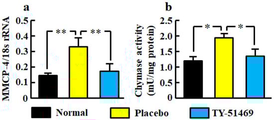 The renal mRNA level of mouse mast cell protease (MMCP-4), which is a mouse chymase, was significantly higher in the placebo-treated group than in the normal group, but it was significantly lower in the TY-51469-treated group than in the placebo-treated group (Figure 2a).