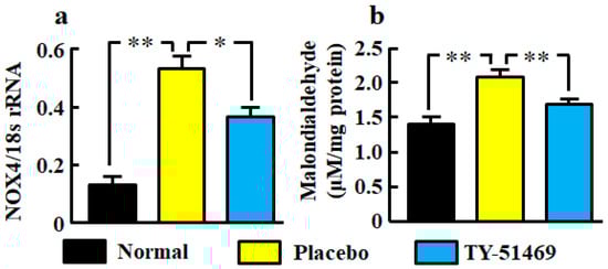 The renal NOX4 mRNA level was significantly augmented in the placebo-treated group compared with the normal group, but it was significantly attenuated in the TY-51469-treated group (Figure 3a). A significant augmentation of the oxidative marker malondialdehyde in kidneys was also observed in the placebo-treated group, but it was significantly attenuated by treatment with TY-51469 (Figure 3b).