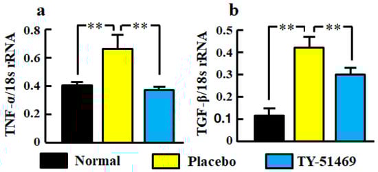 Significant increases of TNF-α and TGF-β mRNA levels in kidneys were observed in the placebo-treated group compared with the normal group, but they were significantly reduced by treatment with TY-51469 (Figure 4a,b).