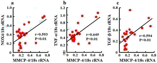Renal total RNA was extracted using Trizol reagent (Life Technologies, Rockville, MD, USA) and subsequently dissolved in RNase-free water (Takara Bio Inc., Otsu, Japan) [47]. Total RNA (1 μg) was transcribed into cDNA with Superscript VIRO (Invitrogen, Carlsbad, CA, USA). Then, mRNA levels were measured by RT-PCR on a Stratagene Mx3000P (Agilent Technologies, San Francisco, CA, USA) using TaqMan fluorogenic probes. RT-PCR primers and probes for MMCP-4 and NOX4, TNF-α, TGF-β, and 18S ribosomal RNA (rRNA) were designed by Roche Diagnostics (Tokyo, Japan). The primers were as follows: 5’-ggcctgtaaaaactattggcatt-3’ (forward) and 5-cacacagtagaggtcctccaga-3’ (reverse) for MMCP-4, 5’-ccctaaacgttctacttttctgga-3’ (forward) and 5-tgctctgcttaaacacaatcct-3’ (reverse) for NOX4, 5’-aggcgaagattactgccaag-3’ (forward) and 5’-catggctatgaggtagagacagg-3’ (reverse) for TNF-α, 5’-tggagcaacatgtggaactc-3’ (forward) and 5’-cagcagccggttaccaag-3’ (reverse) for TGF-β, and 5’-gcaattattccccatgaacg-3’ (forward) and 5’-gggacttaatcaacgcaagc-3’ (reverse) for 18S rRNA. The probes were as follows: 5’-tccaggtc-3’ for MMCP-4, 5’- tcctgctg-3’ for NOX4, 5’-agccccag-3’ for TNF-α, 5’-ttcctggc-3’ for TGF-β, and 5’-ttcccagt-3’ for 18S rRNA. The mRNA levels of MMCP-4, NOX4, TNF-α, and TGF-β were normalized to that of 18S rRNA.