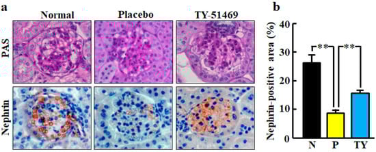 Representative images of glomeruli stained with PAS and immunostained with anti-nephrin antibody (nephrin-positive cells) from normal, placebo-, and TY-51469-treated mice 4 weeks after starting treatment (a). Original magnification was 200× (a). Ratio of nephrin-positive area to total glomerular area in normal (N), placebo (P)-, and TY-51469 (TY)-treated mice 4 weeks after starting treatment (b). Values represent mean ± SEM. ** p < 0.01 vs. placebo-treated group.