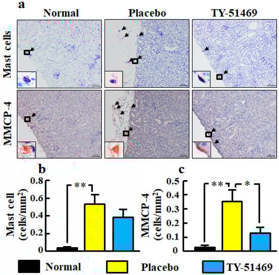 Representative images of kidney sections stained with toluidine blue (mast cells) and immunostained with anti-MMCP-4 antibody (MMCP-4-positive cells) from normal, placebo-, and TY-51469-treated mice 4 weeks after starting treatment (a). Black arrows indicate mast cells and MMCP-4-positive cells (a). The black frame is enlarged to the lower left corner (a). Original magnification was 200× (a). Numbers of mast cells (b) and MMCP-4-positive cells (c) in kidney sections in normal, placebo-, and TY-51469-treated mice 4 weeks after starting treatment. Values represent mean ± SEM. * p < 0.05 and ** p < 0.01 vs. placebo-treated group.