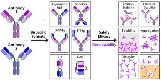 - Datta-Mannan, A.; Brown, R.M.; Fitchett, J.; Heng, A.R.; Balasubramaniam, D.; Pereira, J.; Croy, J.E. Modulation of the Biophysical Properties of Bifunctional Antibodies as a Strategy for Mitigating Poor Pharmacokinetics. Biochemistry 2019, 58, 3116–3132. [Google Scholar] [CrossRef]