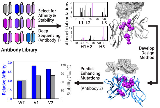 Evaluation and prediction of mutations in the VH/VL interface that enhance the stability and affinity of single-chain antibodies. Deep mutational analysis of a scFv library (top left) identified eight interface residues tolerant of mutations (purple, top right). Combinations of affinity-maintaining mutations at these sites were analyzed with Rosetta to predict those that also improve thermal stability. After development using the anti-lysozyme antibody D44.1, the automated design method (AbLift) was validated on two additional antibodies, including the anti-VEGF antibody G6 (bottom right). AbLift designed G6 variants 1 (V1) and 2 (V2) displayed both improved affinity and thermal stability (bottom left). The figure is adapted from a previous publication [60].