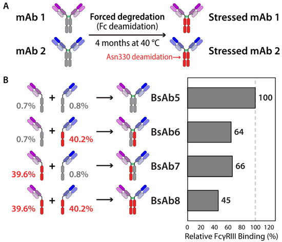Evaluation of the role of chemical modifications (deamidation) on Fc-mediated receptor binding for bispecific antibodies. Bispecific mAbs were generated with asymmetric levels of deamidation and evaluated for their binding to FcγRIII. (A) mAbs 1 and 2 were heat stressed for 4 months to force deamidation in the Fc region (Asn 330). (B) Bispecific mAbs with various levels of symmetric (BsAb5, BsAb 8) or asymmetric (BsAb6, BsAb7) deamidation were produced through Fab-arm exchange of pooled native and stressed mAbs. The resulting bispecific antibodies display reduced levels of FcγRIII binding relative to BsAb5 in a manner consistent with total levels of deamidation. The figure is adapted from a previous publication [128].