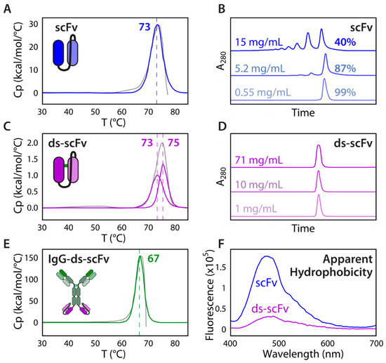 Impact of an additional intramolecular disulfide bond in single-chain antibody fragments, either in isolation or as IgG-scFv bispecific antibodies, on their biophysical properties. Comparison of an anti-IL17 scFv with and without an additional intramolecular (H44-L100) disulfide bond as isolated scFvs or IgG-scFv fusions. (A) Differential scanning calorimetry (DSC) thermogram and (B) analytical SEC chromatograms for the wild-type scFv. (C) DSC thermogram and (D) analytical SEC chromatograms for the disulfide-stabilized scFv. (E) DSC thermogram of the disulfide-stabilized bispecific antibody. (F) ANS fluorescence emission (300 µM ANS) of the wild-type (blue) and disulfide-stabilized (purple) scFvs. In (A,C,E), the raw data are shown in grey, and the fitted data are shown in color (blue, purple or green). The figure is adapted from a previous publication [155].