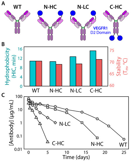 Effect of molecular architecture of IgG fusion proteins on their hydrophobicities, stabilities, and pharmacokinetic properties. (A) Representations of various IgG-extracellular domains (ECDs) with the D2 domain of VEGFR1 fused to different regions of the wild-type IgG. (B) Hydrophobicity measured by hydrophobic interaction chromatography (HIC; blue) and stability (first thermal unfolding transition, red) of the wild-type (WT) IgG and IgG-ECDs. (C) Pharmacokinetic profiles of the WT IgG and IgG-ECDs in cynomolgus monkeys (single 2 mg/kg iv dose) reveal increased clearance rates for more hydrophobic formats. The figure is adapted from a previous publication [219].