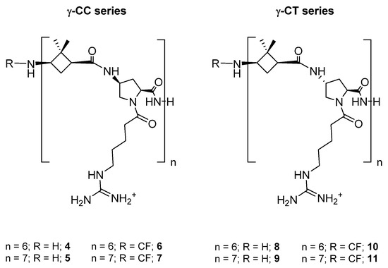 Two series of dodecameric and tetradecameric hybrid oligomers (4–11) were synthesized. They were formed by the repetition of a dipeptide motif made up by (1S,3R)-γ-CBAA, 1, [21] linked to a conveniently functionalized cis- or trans-γ-amino-l-proline (γ-CC series and γ-CT series, respectively), (Chart 1). All of them were prepared using standard protocols of solid phase peptide synthesis (SPPS), either in their free N-terminus form or functionalized with a carboxyfluorescein (CF) fluorescent group, as detailed at the Section 3 and the Supplementary Materials (SM).