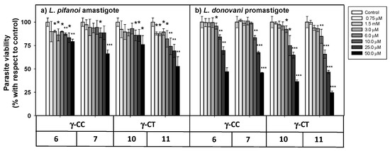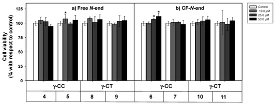 As a first step to establish the soundness of γ-CC and γ-CT peptides as therapeutic CPP for Leishmania, peptides 4–11 were assayed for their toxicity on HeLa cells, used as a model of mammalian cells. The cellular viability after 24 h incubation with the respective peptide was assessed by the reduction of 3-(4,5-dimethylthiazol-2-yl)-2,5-diphenyltetrazolium bromide (MTT) [56] (Figure 2).